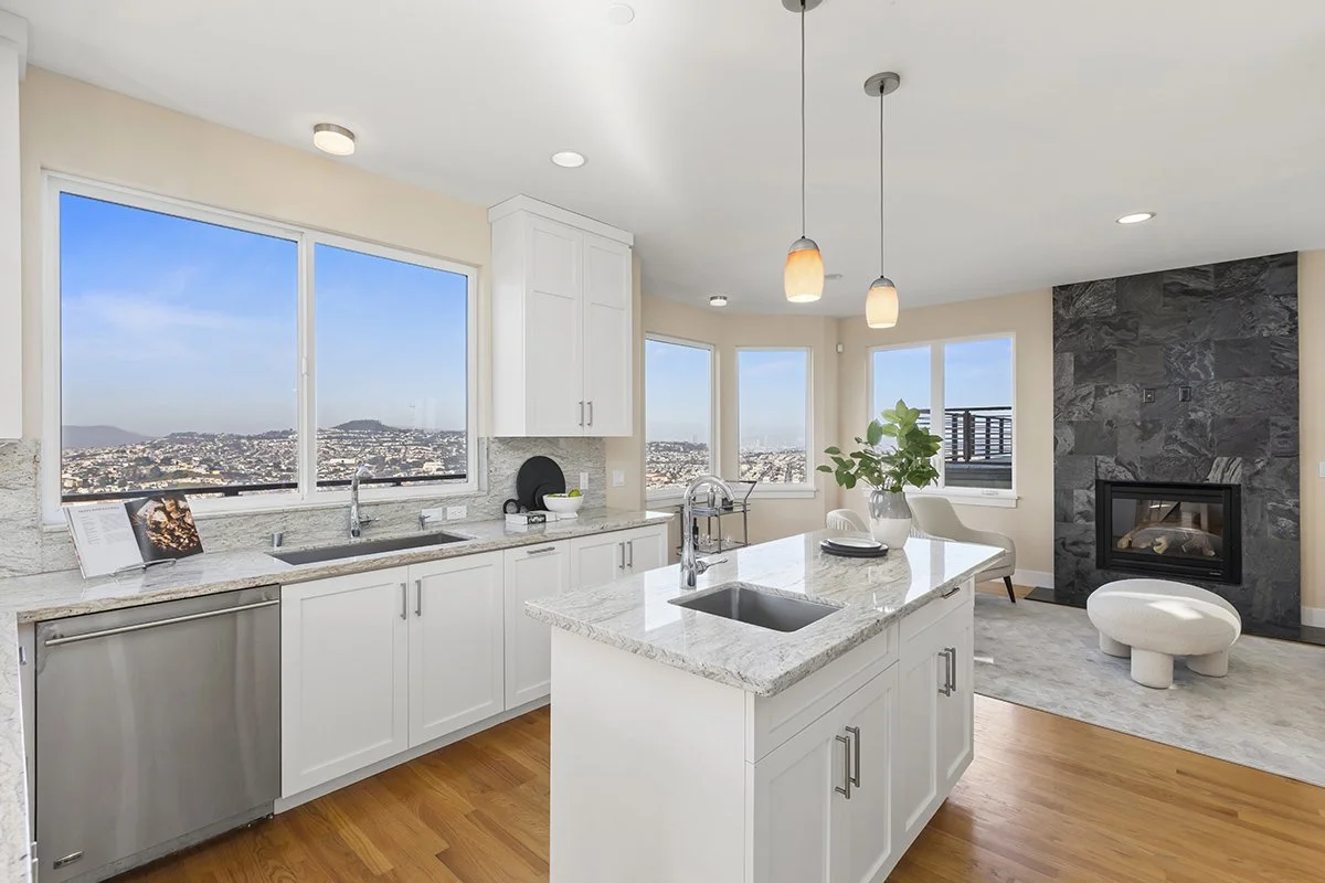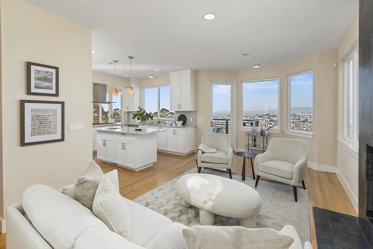 An open, flowing floor plan with 9-foot ceilings, hardwood floors on both levels, central vacuum, and elegantly tiled baths complements the west-facing deck that frames sweeping ocean and city vistas - spanning San Francisco, Muir Beach, the Bay Bridge, the East Bay, and beyond.